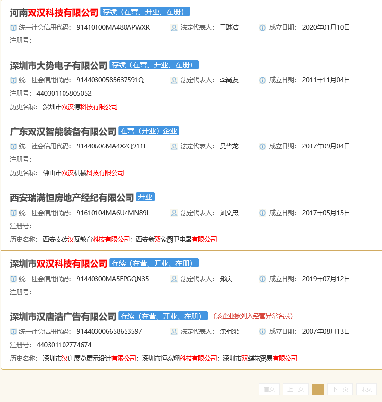 不僅如此,辰奕智能的董事長兼總經理為胡衞清,招股書披露其出生於1979年7月,早年於1999年7月至2003年7月就職於雙漢科技(深圳)有限公司任採購主管,也即胡衞清在入職於雙漢科技時年僅20週歲,由此判斷胡衞清初始學歷是較低的,後來的於2006年9月畢業於北京地質大學財務管理專業以及2009年9月畢業於清華大學EMBA均為後續教育。但據《國家企業信用信息公示系統》查詢“雙漢科技”關鍵字後,並未能發現有“雙漢科技(深圳)有限公司”的註冊記錄,名稱最為相近的“深圳市雙漢科技有限公司”則是成立於2019年7月,這令人質疑辰奕智能披露的實際控制人職業履歷是否真實,對此公司並未回應記者採訪。