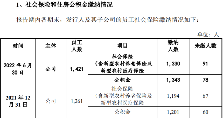 另據招股書披露,在2021年末公司擁有員工1261人,其中社會保險繳納人數為1194人、公積金繳納人數為1201人。但據《國家企業信用信息公示系統》查詢的2021年年報顯示,當年公司的社保信息記錄養老保險繳納人數就多達1259人,這相比招股書披露的社會保險繳納人數多出了65人。