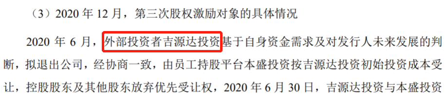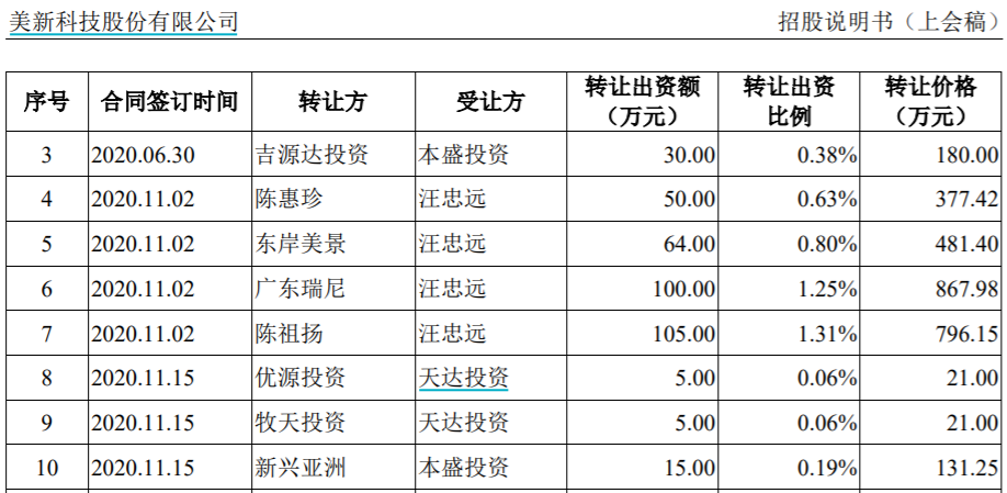 根據招股書第43頁披露,在2020年4月至2020年11月期間,美新塑木發生了多次股東股權變更,其中2020年4月江兆昌、楊玉華向公司控股股東新興亞洲轉讓所持股份轉讓單價約為7.45元/註冊資本,隨後在2020年6月吉源達投資向本盛投資轉讓30萬元出資額,對應單價僅為6元/註冊資本,顯著低於前次股權轉讓單價。對此,招股書第89頁披露:“2020年6月,外部投資者吉源達投資基於自身資金需求及對發行人未來發展的判斷,擬退出公司,經協商一致,由員工持股平台本盛投資按吉源達投資初始投資成本受讓,控股股東及其他股東放棄優先受讓權。”
