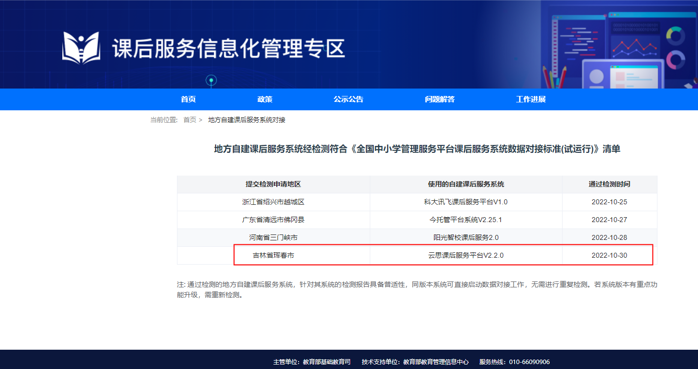 本次教育部教育管理信息中心公佈首批地方自建課後服務平台系統通過檢測名單,是加快推進義務教育學校課後服務信息化管理工作的重要成果,將進一步促進信息化賦能課後服務質量提升,進一步優化課後服務全流程管理,推動課後服務工作提檔升級。