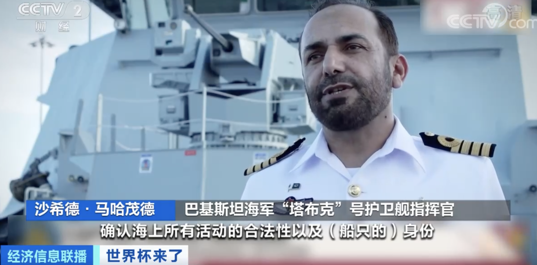 巴基斯坦海軍“塔布克”號護衞艦指揮官 沙希德•馬哈茂德: 我負責在卡塔爾周邊海域進行巡邏,海上安保工作主要是確認海上所有活動的合法性以及船隻的身份,巴基斯坦海軍的使命是維護海上航行和貿易自由,同時應對常規和突發威脅。