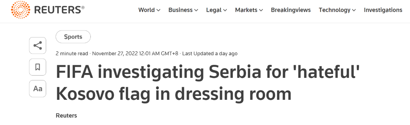 【環球網報道 見習記者 李詩睿】據“今日俄羅斯”(RT)電視台網站、路透社27日報道,在當地時間24日進行的2022年卡塔爾世界盃第一輪巴西隊對陣塞爾維亞隊賽前,塞爾維亞隊更衣室出現了一面表明“科索沃地區是塞爾維亞一部分”的旗幟,在科索沃足協官員要求下,國際足聯26日對此啓動紀律程序。路透社稱,塞爾維亞足協暫未就此事回應置評請求。