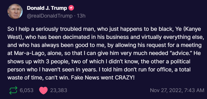 “所以我幫助了一個有嚴重問題的人,他恰好是黑人‘侃爺’(坎耶·韋斯特),他的生意以及幾乎所有其他事情都被摧毀了,但他一直對我很好,我允許他在海湖莊園(和我)單獨會面,這樣我就可以給他非常需要的‘建議’。(當天)他帶着3個人一塊出現了,其中兩個我不認識,另外一個政治人物,我也多年未見。我告訴他(韋斯特)不要競選總統,完全是浪費時間,不會贏的。假新聞都瘋了。”特朗普稱。↓