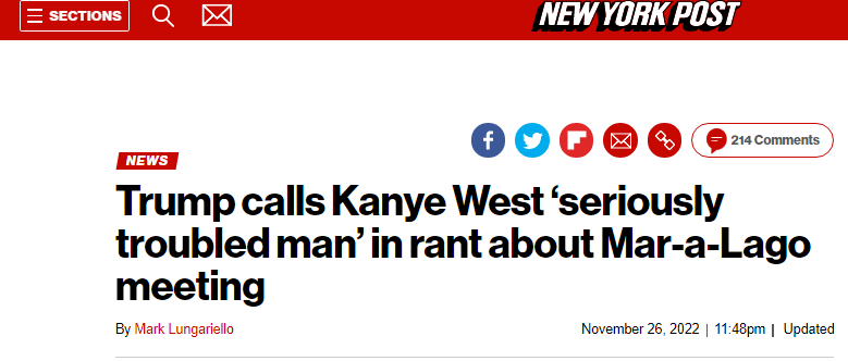 《紐約郵報》介紹,76歲的特朗普於本週二(22日)在佛羅里達州海湖莊園會見了韋斯特和一名白人民族主義者尼克·富恩特斯,並共進晚餐。報道提到,這二人此前都因涉嫌發表反猶言論受到批評。英國《衞報》解釋稱,特朗普的這一行為引發了人們對他有意與極右翼極端分子接觸的擔憂。