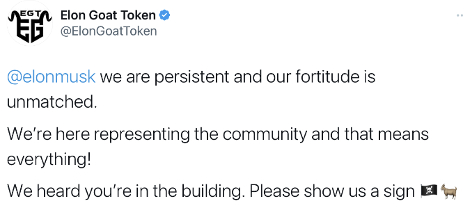 根據“Elon Goat Token”推特賬號當地時間26日晚上發佈的推文:“大約1小時後,我們將在馬斯克的老家奧斯汀送給他‘埃隆山羊’。”不過,在約2個小時後,該項目組又發文稱:“馬斯克,我們堅持不懈,我們的毅力無與倫比。我們在這裏代表一個羣體,這意味着一切。我們聽説你在這棟樓裏。請跟我們打個招呼。”