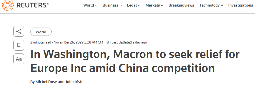 關於能源問題,路透社提到,馬克龍此前就曾抱怨美國的一些做法不合適。今年10月6日,馬克龍表示:“我們要告訴我們的美國朋友們,你們將能源原價賣給本國企業,我們卻要支付四倍的價格。這可不是真朋友該做的事,必須停止。”同月21日,馬克龍再次向美國“開火”,指責美國在出售天然氣上搞“雙重標準”。11月8日,馬克龍在巴黎會見近50家大型企業負責人時,又一次表達不滿,“美國生產廉價天然氣,然後向我們(歐洲)高價售賣,同時他們還對部分產業給予大規模補貼,導致歐盟相關產業最終退出市場。我認為它(美國《通脹削減法案》)不符合世貿組織規則,同時也不友好。”他稱。