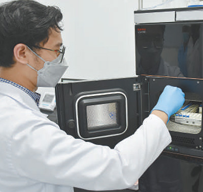工作人員在印尼mRNA疫苗生產基地對疫苗進行質量控制檢測。
