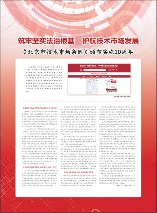 科技是第一生產力、人才是第一資源、創新是第一動力。2002年,《北京市技術市場條例》(簡稱《條例》)頒佈實施。多年來,北京市技術市場工作堅持以創新主體需求為導向,以技術合同認定登記為基礎,以促進科技成果轉化為核心,以支撐北京國際科技創新中心建設為目標,持續完善技術市場政策體系和服務體系,技術市場發展成效顯著。2021年,全市認定登記技術合同93563項,技術合同成交額7005.7億元,北京技術交易規模連續20年位居全國首位。