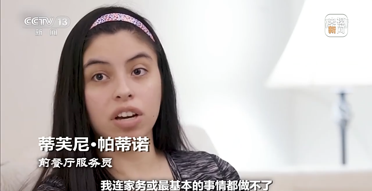 *前餐廳服務員 蒂芙尼·帕蒂諾:*我連在家生活都勉強,我連家務或最基本的事情都做不了,我該怎樣去工作,我怎麼可能保住工作?我之前的職業,我是個服務員,那可是個體力活,我要從一個桌子跑到另一個桌子,一干就是好幾個小時,從下午四點幹到午夜,我現在做不了這樣的工作。