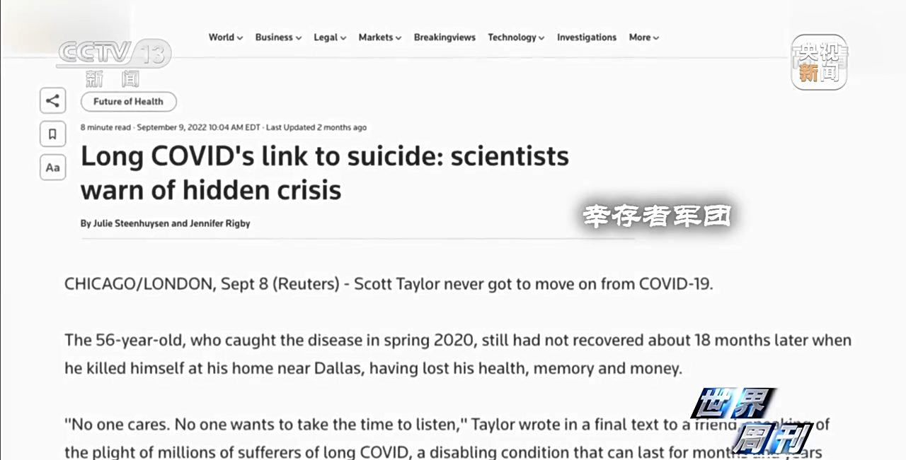 “倖存者軍團”是一個由“長新冠”患者組成的互助組織,今年5月,該組織發起了一項“長新冠與自殺關聯性”的調查,在近 200名受訪者中,有44%的人表示他們認真考慮過自殺。原因是這些人認為,他們已經不再是患病前的自己。沒有盡頭的“長新冠”症狀的折磨促使他們形成了自殺的想法。