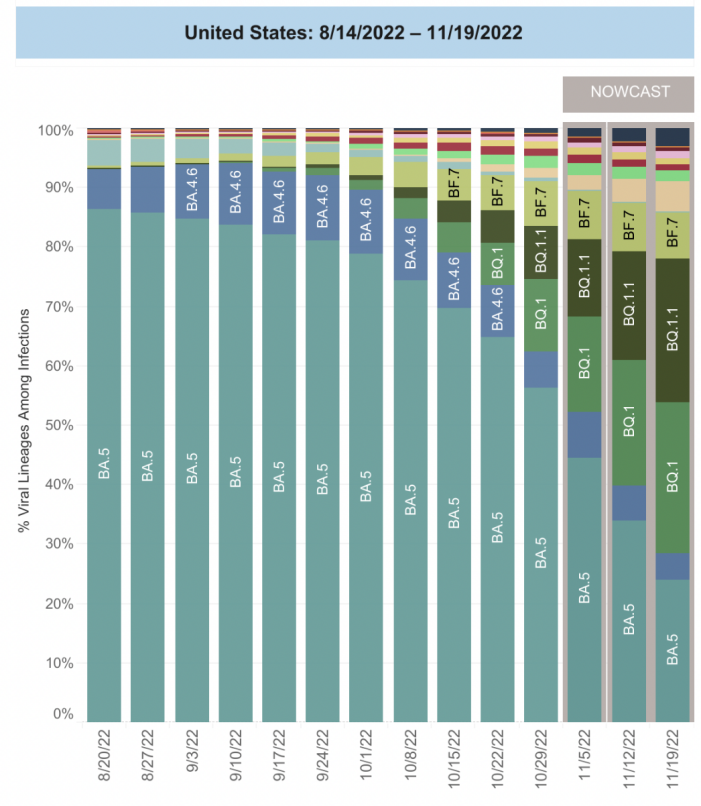 美國疾控中心表示,早前主導美國的奧密克戎BA5型毒株正在被其亞型突變株快速取代。美國CSH實驗室的報告指出,其中BQ1和BQ1.1型突變株的傳染力是BA5型毒株的7倍,且具有更強的逃逸性。這些新亞型正在美國人口密集的一線城市快速傳播。