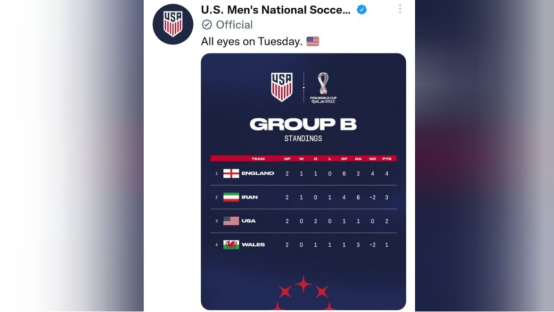 據RT報道,美國國家男子足球隊(USMNT)在其社交媒體賬號發佈了一張B組小組賽積分榜,包括英格蘭、伊朗、美國和威爾士的積分和排名。然而,排在第二位的伊朗國旗上少了中心的國徽標誌。