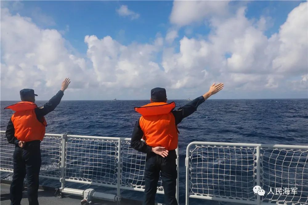 ▲11月25日,參加中越北部灣聯合巡邏的中方艦艇官兵向越方揮手告別。倪子純 攝