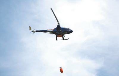 北京航景創新科技有限公司的大載荷無人機在進行森林滅火實戰演練。