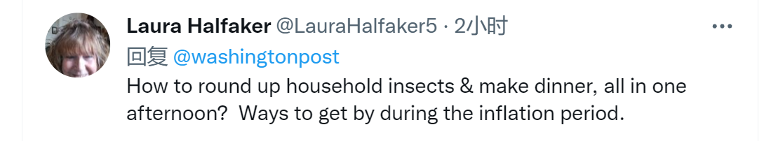 還有人提到當前美國通脹水平加以諷刺,“如何在一個下午就把家裏的昆蟲都抓住並做好晚餐?在通貨膨脹時期的生活方式。”↓