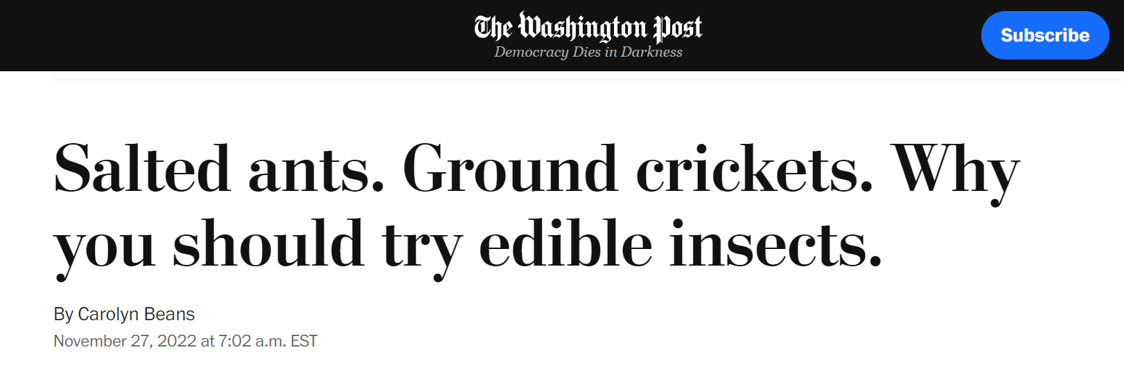 RT説,《華盛頓郵報》這篇文章是該媒體和其他一些媒體,向美國人及西方其他國家消費者推銷吃昆蟲的一系列努力中的最新的動作。在網上快速搜索一下就會發現,《華盛頓郵報》至少從2013年開始就一直在反覆討論這個話題,發佈的文章標題包括“為什麼昆蟲一定是人類食物鏈中更重要的一部分”和“為什麼你可以、應該而且很可能會吃昆蟲”,2019年的一篇文章題目是“你會為了拯救地球而吃昆蟲嗎?”