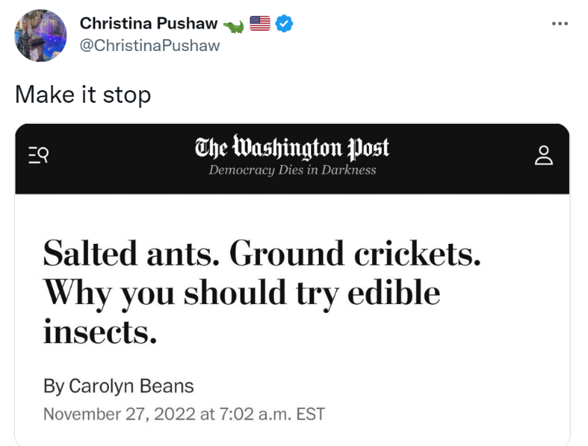 有人提出質疑稱,“一切就這樣開始了。我想看看在這一提議被公佈之前,有多少政客投資了可食用昆蟲公司。”↓