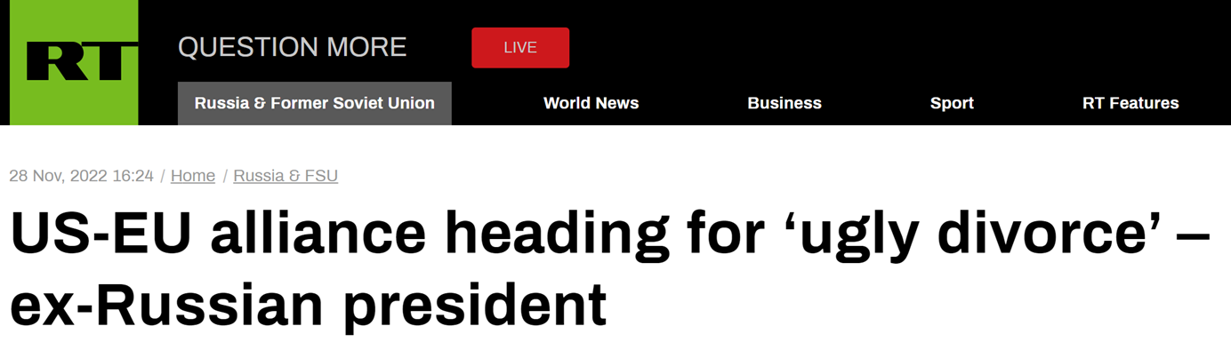 梅德韋傑夫發表這一評論之際,RT稱,多家媒體報道歐盟國家對美國在俄烏危機中的機會主義行為感到越來越憤怒,歐盟的公開聲明和西方媒體的報道都反映了美歐之間日益加深的裂痕。