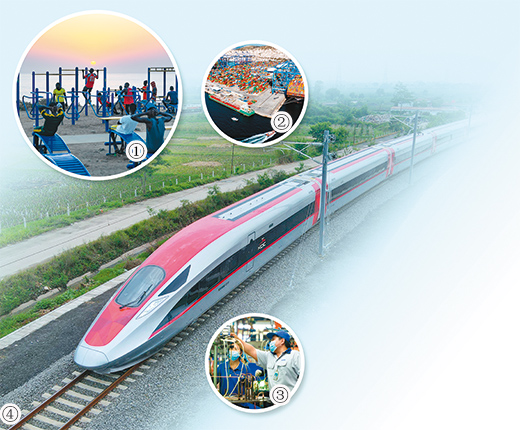 圖④:11月9日,在印度尼西亞西爪哇省萬隆市,一列高鐵動車組正在雅萬高鐵試驗段進行熱滑試驗。