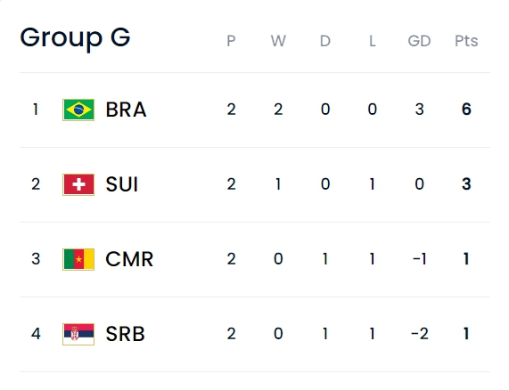 形勢:瑞士取勝可確保出線,塞爾維亞、喀麥隆末輪獲勝才有晉級的可能。