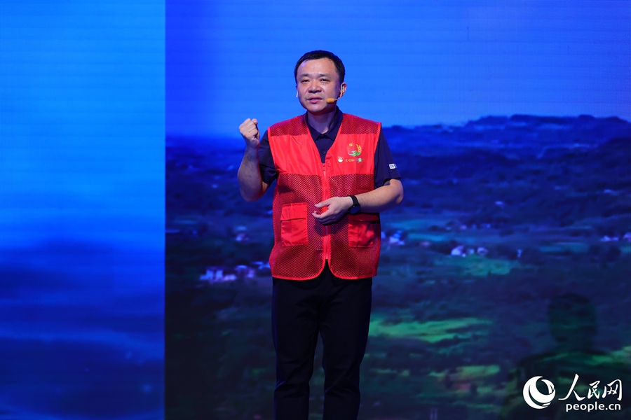 台灣青年、四川省涼山彝族自治州冕寧縣元升農業科技有限公司副總經理林書任在現場講述奮鬥故事。人民網 陳永整攝