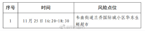 現有新冠肺炎陽性病例曾於11月26日-11月28日在以下2處點位有活動軌跡,請與以下軌跡有交集的人員立即主動向屬地疫情防控部門、社區(村)或單位報告,停止外出活動,嚴格做好個人防護,並配合落實相關管控措施。