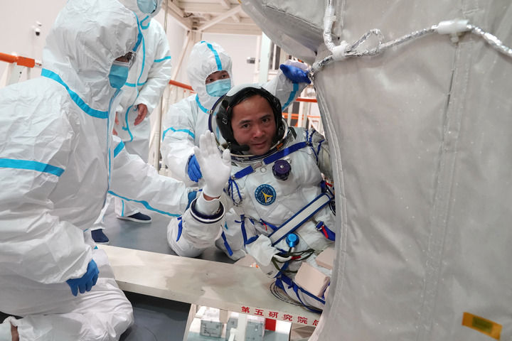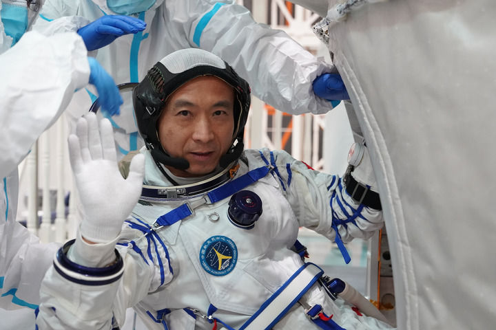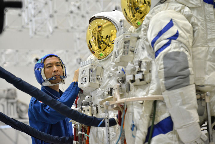 ↑費俊龍參加人船聯試(2022年3月28日攝)。新華社發(孔方舟 攝)