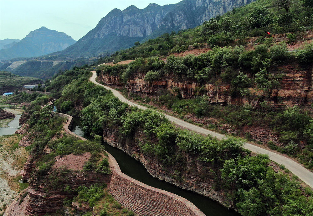 紅旗渠蜿蜒起伏,如一條巨龍盤旋於巍巍太行山脈。