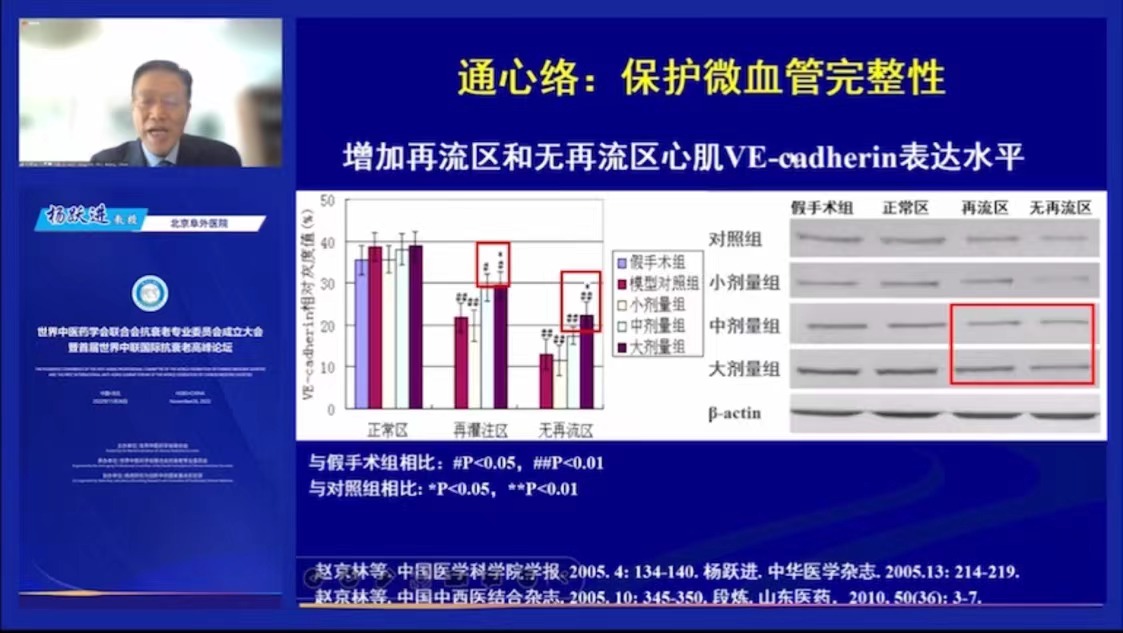 為了驗證通絡藥物對於血管的防護作用,楊躍進教授及其團隊從微血管疾病入手,對通心絡膠囊展開了多項實驗研究。結果發現,通心絡膠囊可以增加內皮細胞間的連接蛋白,從而保護微血管的完整性,並起到一定的抗炎作用。