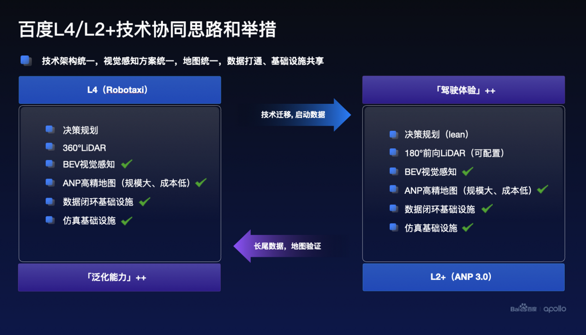 汽車智能化時代,百度也積極將自動駕駛技術落地高級輔助駕駛產品,探索L4/L2+技術共生路線。百度自動駕駛技術專家王亮認為,百度賦能汽車智能化的信心和底氣源於十年自動駕駛技術沉澱。目前,技術棧層面已實現L4與L2+智駕產品視覺感知方案統一、技術架構統一、地圖統一、數據打通及基礎設施共享。L4持將續為L2+智駕產品提供先進的技術遷移,L2數據反哺也將助力L4泛化能力提升。同時,王亮也強調高精地圖是保障L2+級智駕產品高安全、體驗好的必需必要條件。