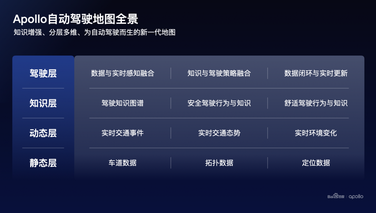 對於L4級自動駕駛而言,要達到99.99%以上的成功率,地圖是不可或缺的底層能力。百度Apollo發佈了Apollo自動駕駛地圖全景,提出知識增強、分層多維、為自動駕駛而生的新一代地圖趨勢。目前,百度高精地圖構建自動化率已達到96%,大幅解決了應用成本高的問題。同時,為保障高安全性,Apollo 自動駕駛地圖融合車端感知數據與多源地圖,即時生成在線地圖,滿足自動駕駛過程中即時更新的需求,確保自動駕駛安全。