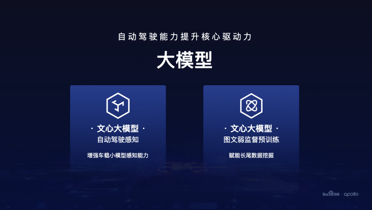 大模型技術是自動駕駛行業近年的熱議趨勢,百度自動駕駛依託文心大模型特色優勢,率先實現技術應用突破。利用文心大模型-圖文弱監督預訓練模型,背靠文心圖文大模型數千種物體識別能力,百度Apollo大幅擴充了自動駕駛語義識別數據,如:特殊車輛(消防車、救護車)識別、塑料袋誤檢等,自動駕駛長尾問題解決的效率實現了指數級提升。此外,得益於文心大模型-自動駕駛感知模型10億以上參數規模,通過大模型訓練小模型,自動駕駛感知泛化能力顯著增強。
