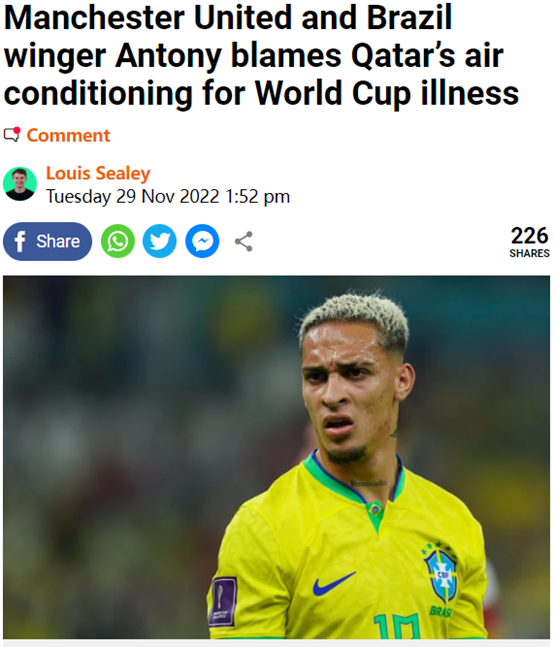 《地鐵報》稱,由於當地氣温高達30攝氏度,多哈的體育場、訓練設施和酒店等都安裝了空調。《鏡報》稱,上週,桑巴軍團內部多名球員開始出現身體不適,正從腳踝傷勢中恢復的內馬爾也是出現發燒症狀的人之一。“安東尼懷疑,在卡塔爾的8個比賽場館中,部分場館的空調是導致球隊隊員多人身體不適的罪魁禍首。”