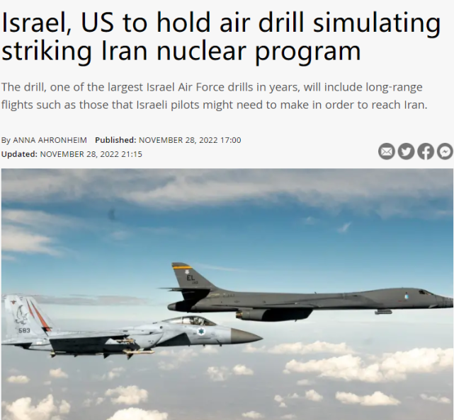 報道稱,這場演習於11月29日至12月1日在地中海和以色列進行,參加演習的包括美以兩國空軍的加油機和戰鬥機,演習內容包括遠程飛行,而以色列飛行員想要駕駛軍機抵達伊朗領空必須進行此類遠程飛行。