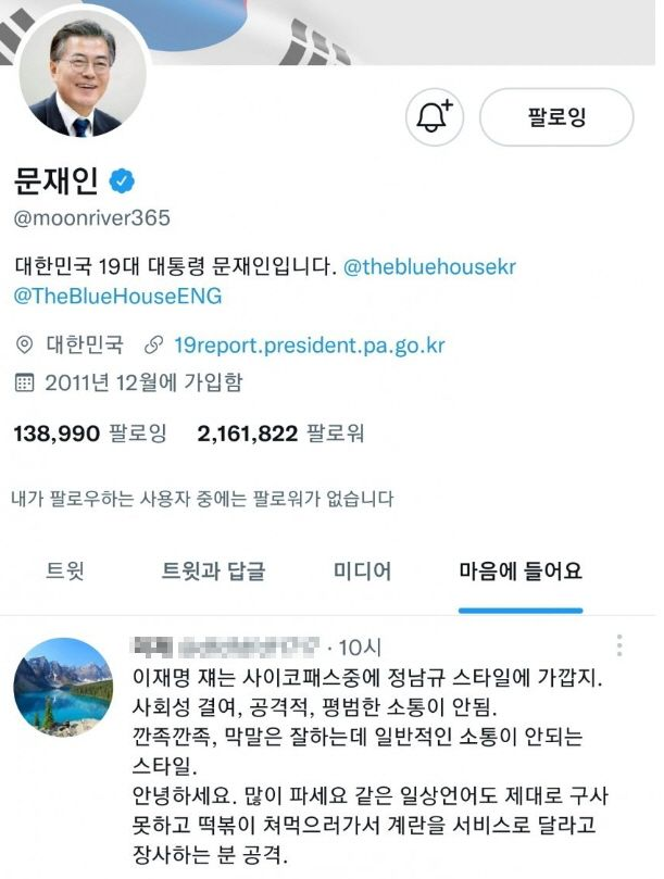 據報道,29日,韓國政界有人稱,文在寅於本月26日在其推特賬號上“點贊”了一條稱李在明是“精神病患者”的帖文。相關帖文還稱李在明“缺乏社會性”、“具有攻擊性”、“擅長鬍言亂語,無法與其進行正常溝通”。有人在發現相關情況後,將文在寅推特主頁頁面截圖,並上傳於其他社交媒體平台,由此引發爭議。