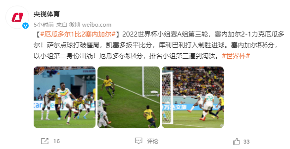 2022世界盃小組賽A組第三輪,塞內加爾2-1力克厄瓜多爾!薩爾點球打破僵局,凱塞多扳平比分,庫利巴利打入制勝進球。塞內加爾積6分,以小組第二身份出線!厄瓜多爾積4分,排名小組第三遭到淘汰。