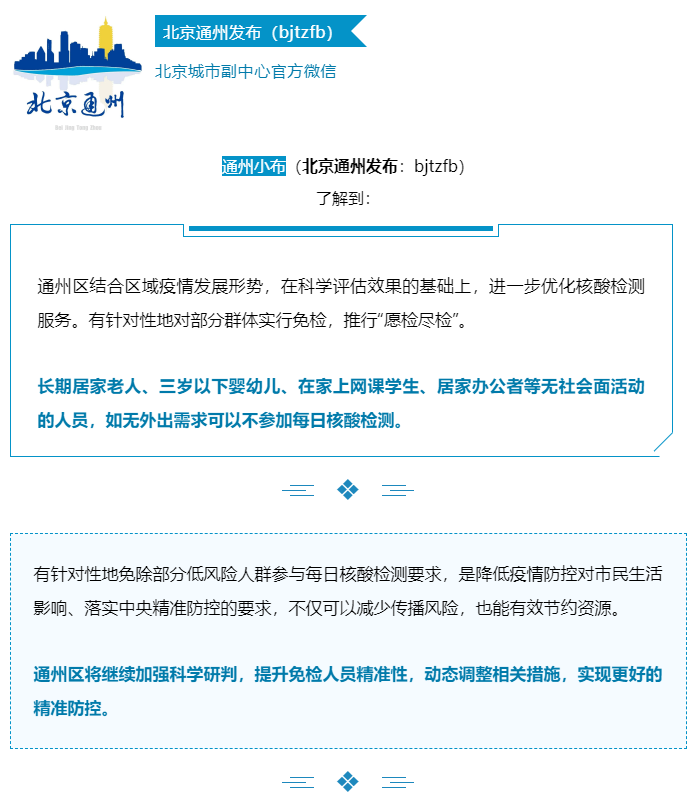 11月30日,通州區發佈通知,結合區域疫情發展形勢,在科學評估效果的基礎上,進一步優化核酸檢測服務。有針對性地對部分羣體實行免檢,推行“願檢盡檢”。