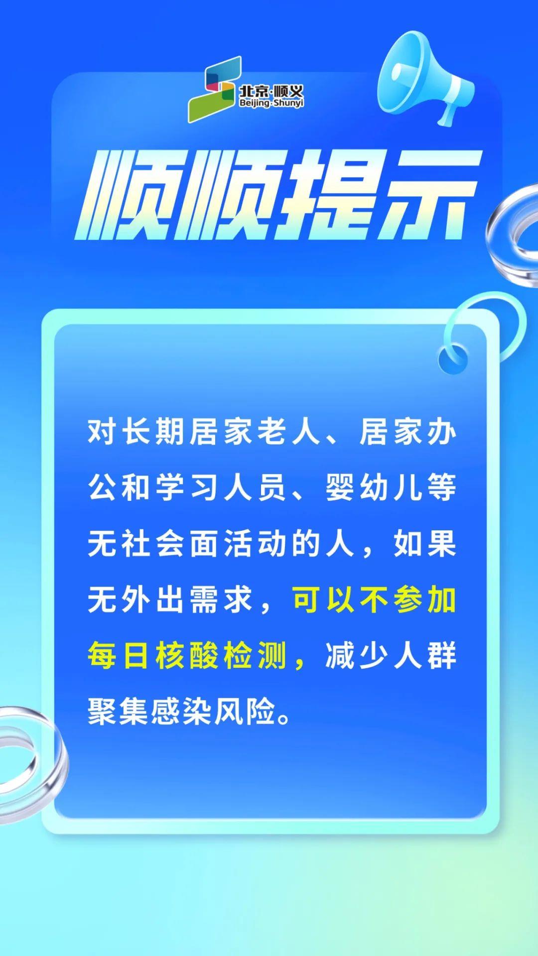 為減少人羣聚集感染風險,節約全區核酸檢測資源,長期居家老人、每日上網課學生、嬰幼兒、居家辦公等無社會面活動的人員,如果沒有外出需求,可以不參加每日核酸檢測。
