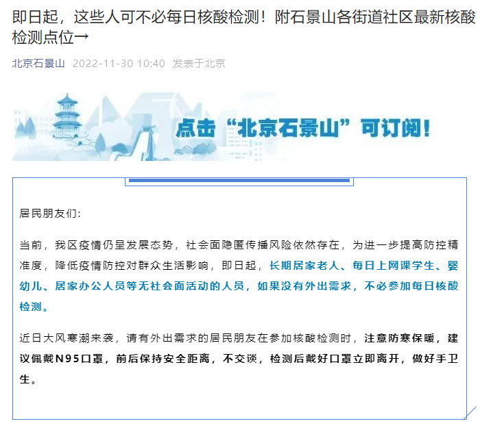 當前,石景山區疫情仍呈發展態勢,社會面隱匿傳播風險依然存在,為進一步提高防控精準度,降低疫情防控對羣眾生活影響,即日起,長期居家老人、每日上網課學生、嬰幼兒、居家辦公人員等無社會面活動的人員,如果沒有外出需求,不必參加每日核酸檢測。