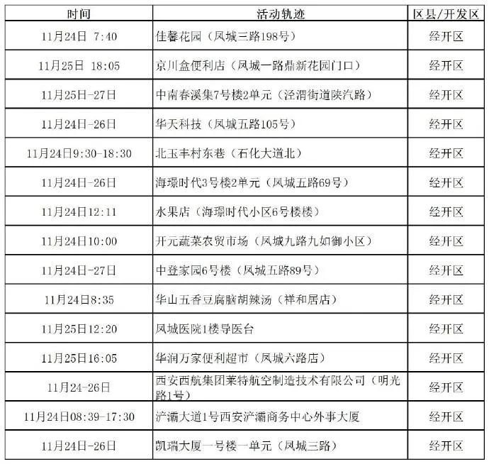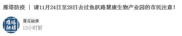 為及時有效阻斷疫情傳播風險,請11月24日00:00至11月28日24:00去過雁塔區魚躍路慧康生物產業園的市民羣眾立即主動向所在社區(村)、單位或酒店報備,按照屬地疫情防控指揮部要求分類落實防控措施。前往報備途中請嚴格落實防疫要求,做好個人防護,不得乘坐公共交通工具。