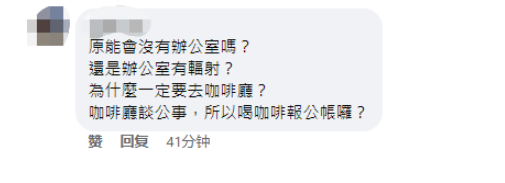 還有人諷刺,“‘原能會’沒有辦公室嗎?還是辦公室有輻射?為什麼一定要去咖啡廳?咖啡廳談公事,所以喝咖啡報公賬囉?”↓