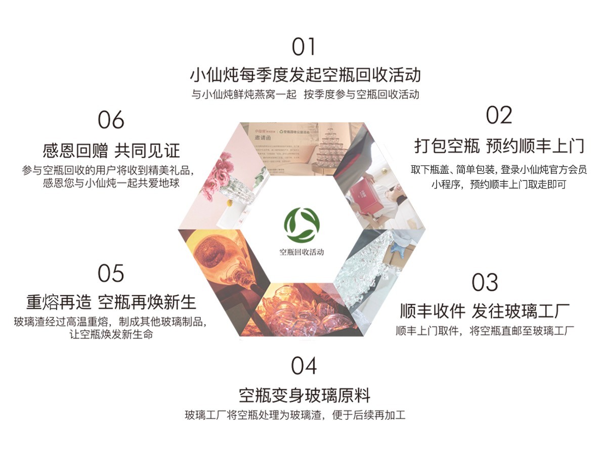 小仙燉自2019年起按季度開啓空瓶回收公益活動,從用户手中回收燕窩空瓶,發往玻璃工廠經過高温重熔,再造為玻璃製品,讓廢舊玻璃煥發新生。