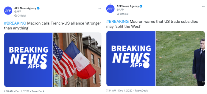 12月1日,在報道法國總統馬克龍訪美的首日行程時,法新社兩條緊挨着的報道出現了非常矛盾的一幕:在前一條內容裏,馬克龍稱“美法同盟無比牢固”,可緊挨着的下一條內容裏,馬克龍又尖鋭地批評美國的貿易補貼“分裂了西方”。