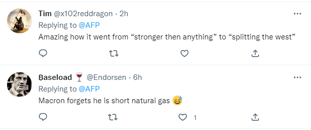 因此,在法新社的社交媒體平台上,就出現了馬克龍一邊稱讚美法關係牢固,一邊指責美國“分裂了西方”的兩條立場截然相反的表態,有網民調侃:“這是怎麼突然從‘牢不可破’變成了‘分裂西方’的?”