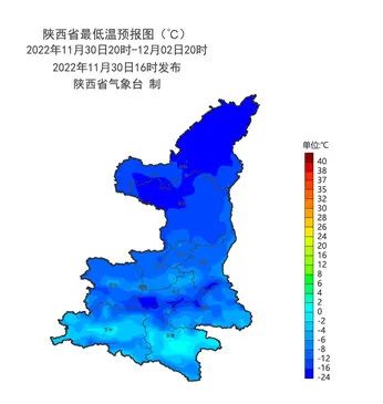 根據陝西省氣象台觀測,今晨全省共90個區縣最低氣温低於0℃, 延安和關中陝南氣温繼續下降,降温幅度最大為武功5.2℃。全省最低氣温(截止06時)分佈:陝北-19~-13℃,最低神木-18.6℃;關中-13~-4℃,最低旬邑-12.6℃;陝南-7~1℃,最低洛南-7.0℃。