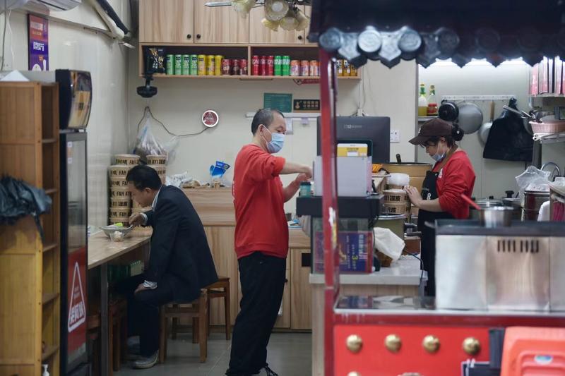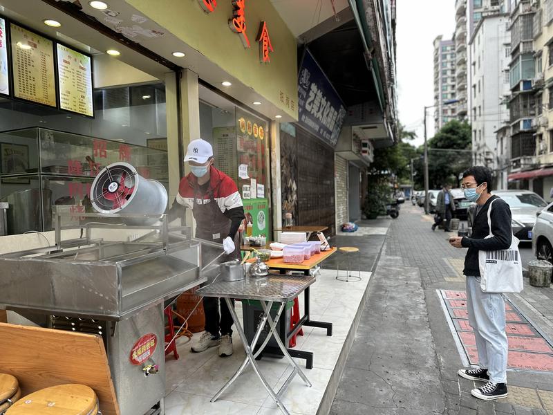 昌崗路附近的早餐店已冒起熱滾滾的蒸汽,向早起的市民遞出一碟碟新鮮出爐的腸粉。店員表示,今天海珠區恢復堂食,歡迎大家進店用餐。↓
