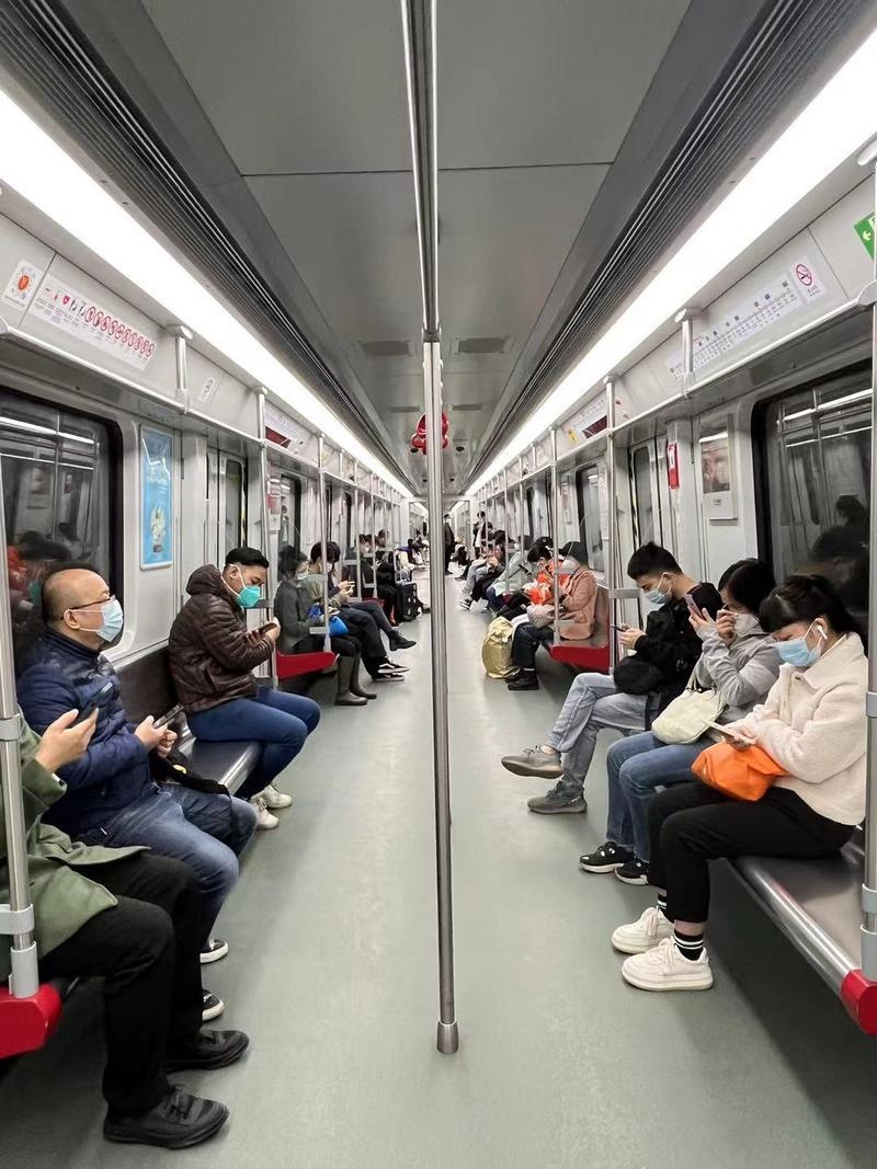 地鐵8號線(滘心方向)上,市民有序出行,且自覺隔座就坐。↓