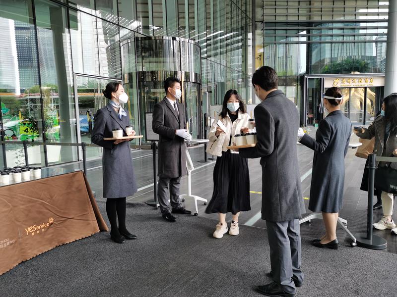 上午8點30分左右,記者在天河區珠江新城的廣州國際金融中心(廣州西塔)現場看到,市民陸續進入大廈。在大廈北門入口需要掃場所碼,出示綠碼,測温進入。
