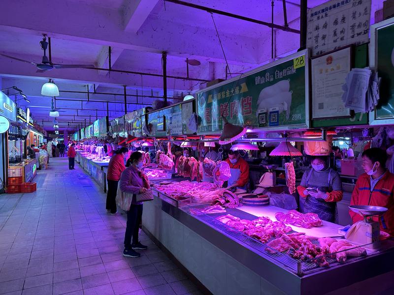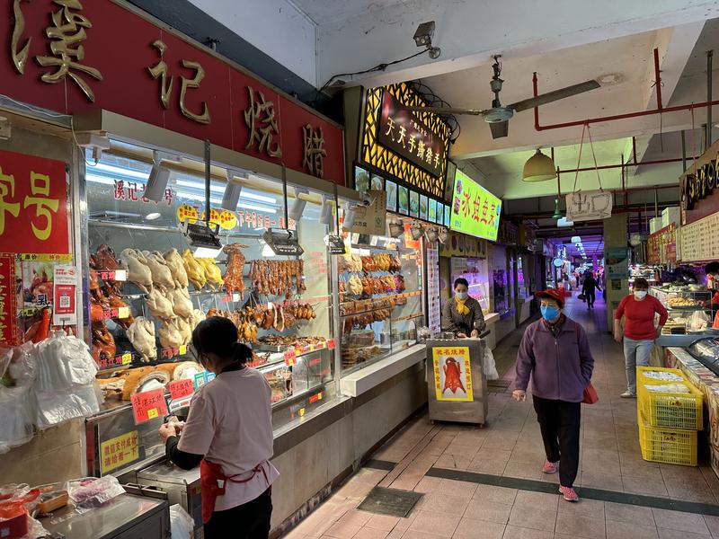 早上7點50分,記者來到海珠區昌崗街道的細崗肉菜市場,市場今日恢復營業早早開門,檔主們陸續把新鮮肉菜放上檔口。↓