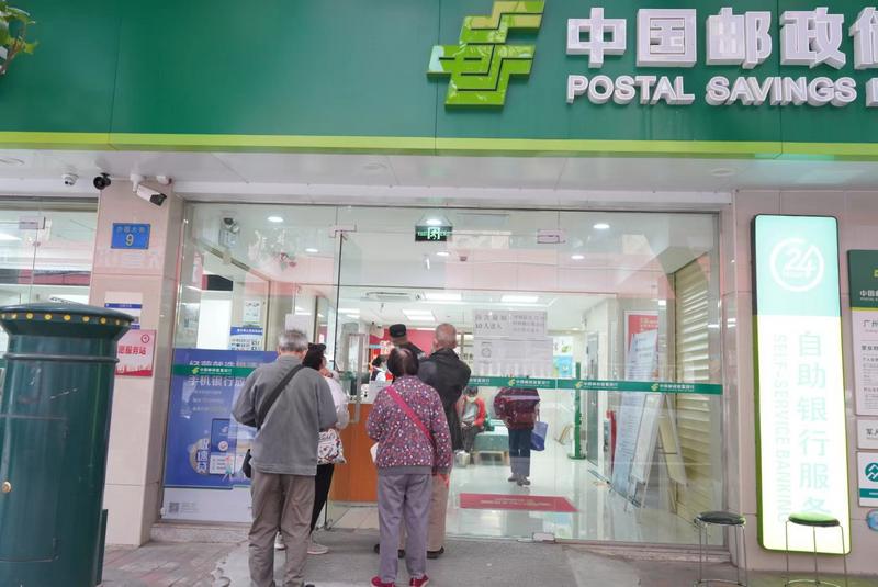 在海珠區沙園郵政支局門外,有市民排隊等候辦理業務。↓